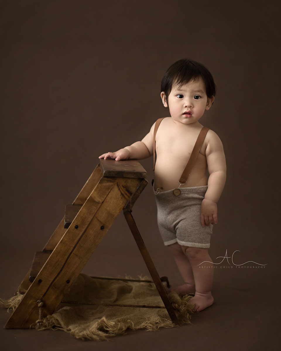 1 year old boy stands next to wooden step ladder during a professional photo session | London