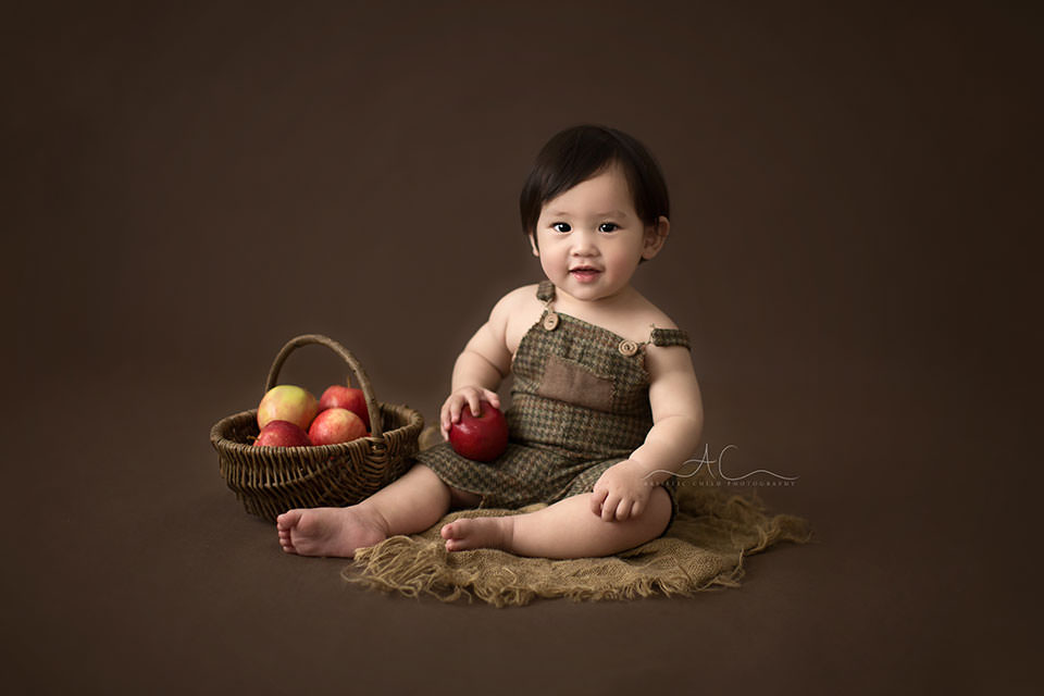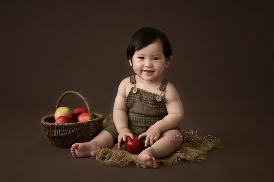 1 year old boy plays with the wicker basket full of red apples during his professional photo session | London